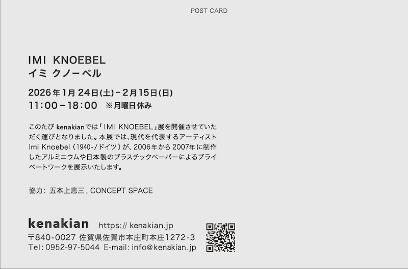 このたび kenakianでは、「IMI KNOEBEL」展を開催させていただく運びとなりました。本展では、現代を代表するアーティストImi Knoebel(イミ クノーベル/1940 – ドイツ)が2006年から2007年に制作した、アルミニウムや日本製プラスチックペーパーによるプライベートワークを展示いたします。ご覧いただくのは、当時イミ クノーベルがスタジオで繰り広げたコンセプトやアイデアそのものであり、トレーニングとして生み出された作品の数々です。どうぞ、想像や思い巡らせ、作品を、ご鑑賞をお楽しみください。